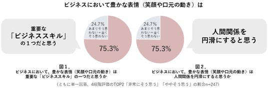 仕事上も初対面の機会が増える春。ビジネスにおいて、豊かな表情(笑顔や口元の動き)は「人間関係を円滑にすると思う」と回答した人が75.3%(図1.)、「重要なビジネススキルの一つだと思う」と回答した人も75.3%に上りました(図2.)。大多数の働く女性が、仕事のパフォーマンスや信頼関係の構築において、言葉の内容だけでなく「表情の重要性」を強く認識していることがわかります。