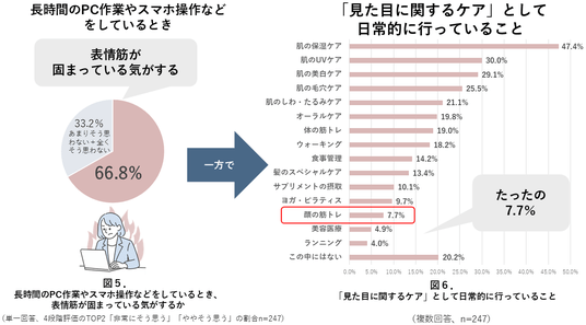 オンライン会議や長時間のPC作業が日常化する中、「表情筋が固まっている気がする」と自覚している人は66.8%(約7割)に上りました(図5.)。 にもかかわらず、日常的な「見た目に関するケア」として、豊かな表情につながる「顔の筋トレ」を行っている人はわずか7.7%にとどまっています(図6.)。スキンケアなどに比べてはるかに低く、ビジネスに必須なスキルの土台となる表情筋エクササイズが“手付かず”であることが分かりました。