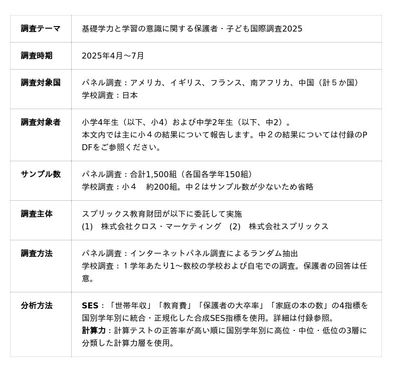 公益財団法人スプリックス教育財団(本部:東京都渋谷区/代表理事:常石 博之)は、基礎学力に対する意識の現状を把握することを目的に、「基礎学力と学習の意識に関する保護者・子ども国際調査2025」を実施しました。本報告では、計算力が伸び悩んでいる子どもが直面している学習上の課題を、計算力や家庭の社会経済的背景(SES)との関係も踏まえて、6か国(アメリカ、イギリス、フランス、南アフリカ、中国、日本)の小学4年生を対象に分析しました。調査結果のポイントは以下の通りです。調査結果のポイント