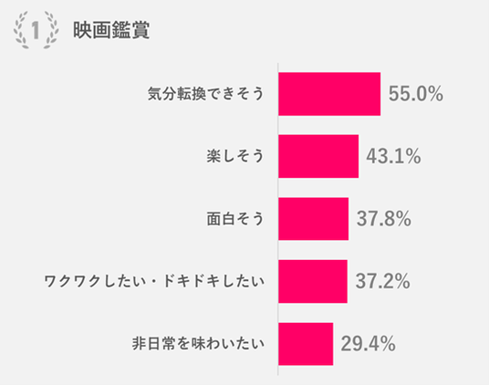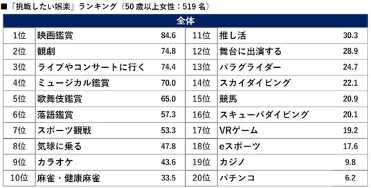 「挑戦したい娯楽」の1位は「映画鑑賞」。50代以上のすべての年代で1位だった。挑戦したい理由の1位は「気分転換できそう」、2位は「楽しそう」、3位は「面白そう」。