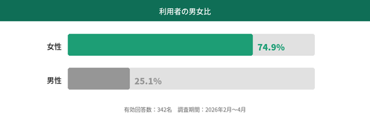 回答者342名のうち、女性は256名(74.9%)と全体の約4分の3を占め、男性(86名・25.1%)を大きく上回りました。