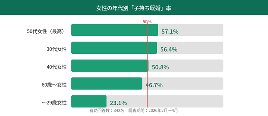 女性の年代別「子持ち既婚」率 - 30代・50代で過半数超