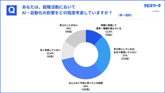 就職活動においてAI・自動化の影響をどの程度考慮しているか尋ねたところ、なんとなく不安に思っている程度33.0%(165名)が最多となりました。多少気にしているが、あまり重視していない27.0%(135名)、明確に意識して業界・職種を選んでいる11.6%(58名)と続き、合わせると、全体の7割以上の学生が、程度はあれど就職活動においてAIの影響を意識していることがわかりました。