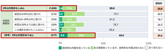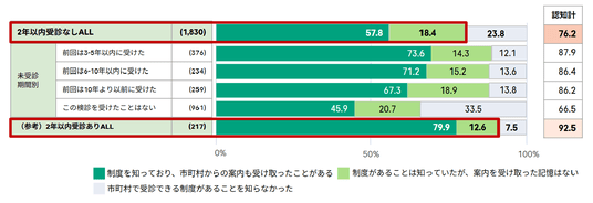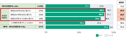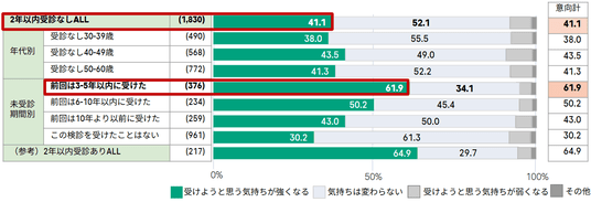 一方で、直近2年間は受診していないものの、過去に受診経験のある層の8割以上が「定期的な受診の必要性」を認識しています(図表 2)。この「定期受診の必要性に対する高い認知」と「実際の行動」のギャップを埋めるためには、個人の意識啓発に留まらず、受診を阻む心理的・物理的なハードルを構造的に改善し、受診停滞期にある層を具体的な受診行動へと促すことが必要と考えられます。
