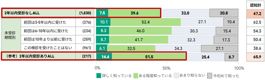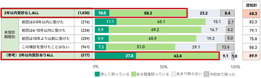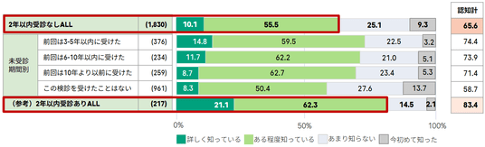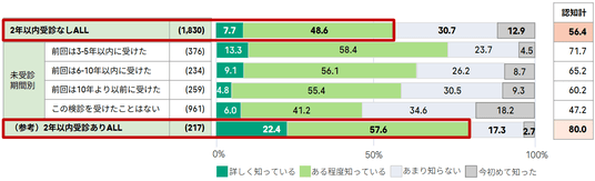 今回の調査では、子宮頸がん検診の未受診期間が長い層ほど、検診や疾患に関する知識・情報認知が低い傾向にあることも明らかになりました。例えば、子宮頸がんは「自覚症状がないまま進行すること」(図表 6)や「早期発見・早期治療で治ること」(図表 8)といった疾患リスクに関する知識が、直近2年以内に受診した層に比べて、未受診層の平均は20ポイント以上低いことがわかります。未受診期間が長い層に対しては、子宮頸がん検診の具体的な価値と、その重要性を浸透させていく必要があります。