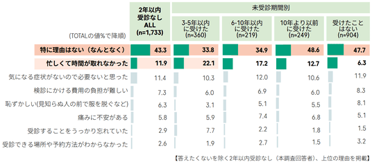 - 未受診者の主な理由は「なんとなく」が43.3%で最多、次いで「忙しい」(11.9%)