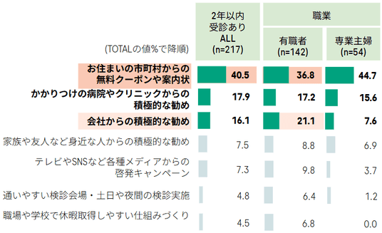 直近2年以内に受診した層に、子宮頸がん検診を受診したきっかけを聞いたところ、主な要因は、「市町村からのクーポン・案内状」であることが明らかになりました(図表 9)。受診層の40.5%が受診のきっかけとして挙げており、これは「かかりつけ医からの勧め」(17.9%)や「職場からの勧め」(16.1%)を大きく上回っています。また、有職者に限定した場合でも「市町村からのクーポン・案内状」(36.8%)が最多となり、「職場からの勧め」(21.1%)よりも高い割合でした。これらの結果は、受診の準備や費用負担に関する障壁を取り除く具体的な情報提供が、受診の意思決定を後押ししていると考えられます。