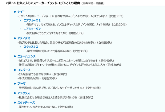 お気に入りのスニーカーブランドは、ナイキ、アディダス、ニューバランス、コンバース、プーマ、アシックス、スケッチャーズなど。「服装に合わせやすい」「足に合っている」が主な理由。<図5>