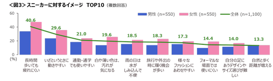 特に女性は、「長時間歩いても疲れにくい」「いざというときに動きやすい」「白や薄い色は、汚れが気になる」のイメージが強い。<図3>