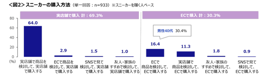 買い方は、「実店舗で商品を検討して、実店舗で購入する」が64.0%と突出して高い。