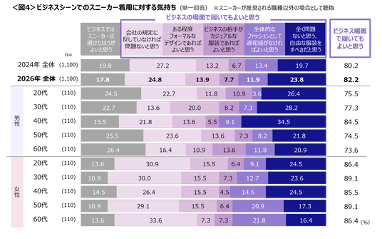 ビジネスシーンでのスニーカー着用は、「全く問題ないと思う、自由な服装をすべきだと思う」が23.8%と、2年前より微増、ビジネスシーンでも履いてよいと思う人は8割越え。