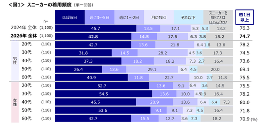 スニーカーを「ほぼ毎日」履いている人は42.8%で、「週1日以上」は74.7%。