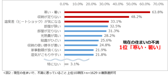 現在の住まいで不満に思っていること1位は「寒い・暑い」。現在の住まいで、不満に思っていることを尋ねたところ、「寒い・暑い」(63.8%)という回答が最も多く、次いで2位が「収納が足りない」(48.2%)、3位「温度差(ヒートショック)が気になる」(33.1%)という結果になりました。(図2)