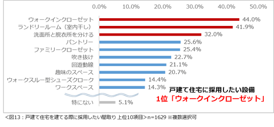採用したい間取りは、「ウォークインクローゼット」(44.0%)が最多。「ランドリールーム(室内干し)」(41.9%)、「洗面所と脱衣所を分ける」(32.0%)と続きました。(図13)