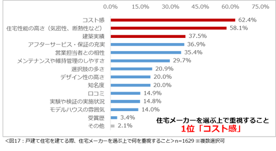 戸建て住宅を建てる際に住宅メーカーを選ぶ上で重視すること1位は「コスト感」。