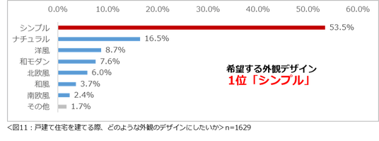 もし戸建て住宅を建てるなら、どのような外観のデザインが良いか尋ねたところ、「シンプル」(53.5%)が1位となりました。(図11)