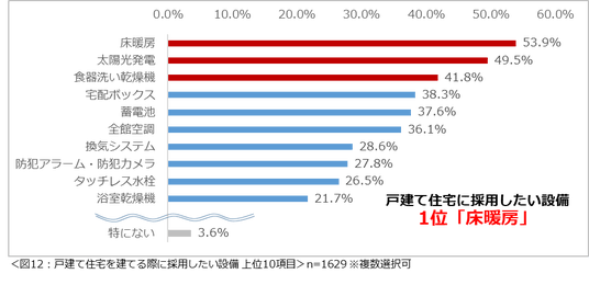戸建て住宅を建てる際に採用したい設備は「床暖房」が最多で半数以上。