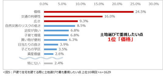 もし戸建て住宅を建てるなら、土地選びで最も重視したい点を尋ねたところ、「価格」(24.5%)という回答が最も多く、次いで2位が「交通の利便性」(16.0%)、3位「広さ」(9.3%)という結果になりました。(図5)