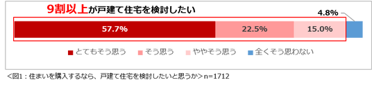 現在、賃貸または実家に住んでいると回答した1712名に、「もし住まいを購入するなら、戸建て住宅を検討したいと思いますか?」と尋ねたところ、「とてもそう思う」57.7%、「そう思う」22.5%、「ややそう思う」15.0%を合わせると、9割以上の人が戸建て住宅を検討したいと思っていることが分かりました。(図1)
