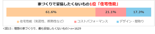 理想の家づくりで「最も妥協したくないもの」について尋ねたところ、「住宅性能」(61.6%)が最多となりました。(図15)