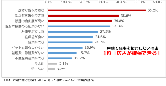 戸建て住宅を検討したいと思った理由1位は「広さが確保できる」。