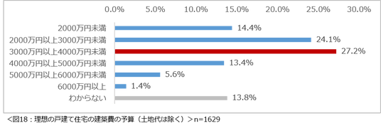 理想の戸建て住宅の建築費の予算について尋ねたところ、「3000万円以上4000万円未満」(27.2%)という回答が最多となりました。(図18)