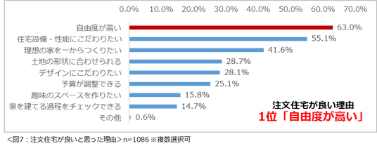 戸建て住宅を購入する際に「注文住宅」を希望すると回答した1086名にその理由について尋ねたところ、「自由度が高い」という回答が最も多く63.0%という結果になりました。(図7)