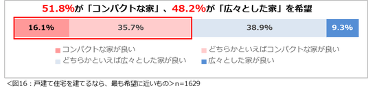 もし戸建て住宅を建てるなら、「コンパクトな家」と「広々とした家」のどちらを希望するか尋ねたところ、「コンパクトな家が良い」(16.1%)と「どちらかといえばコンパクトな家が良い」(35.7%)を合わせて51.8%、「広々とした家が良い」(9.3%)と「どちらかといえば広々とした家が良い」(38.9%)を合わせて48.2%と、ほぼ同数という結果になりました。(図16)