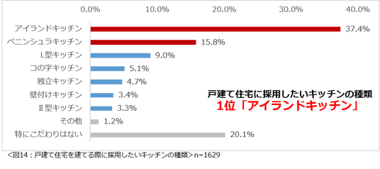 もし戸建て住宅を建てるなら、採用したいキッチンの種類について尋ねたところ、周囲に壁がない、文字通り島のように設置されている「アイランドキッチン」(37.4%)が1位、次いでキッチンの左右どちらかが壁に接している「ペニンシュラキッチン」(15.8%)を希望していることが分かりました。(図14)