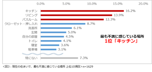 現在の住まいで最も不満に感じている場所を尋ねたところ、「キッチン」(16.2%)という回答が最も多く、次いで2位が「リビング」(13.9%)、3位「バスルーム」(12.3%)という結果になりました。(図3)