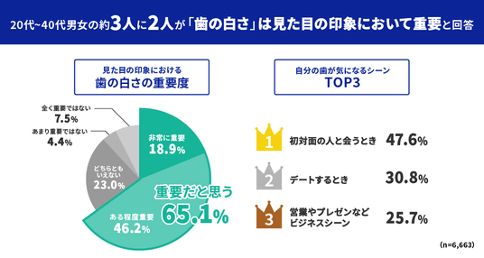 本調査は、2026年2月に首都圏在住の20代~40代男女6,663名を対象に実施しました。「歯の見た目に関する意識」について聞くと、全体の65.1%が「歯の白さ」が見た目の印象を左右すると回答。加えて全体の約半数が「初対面の人と会うとき」に自身の歯が気になると回答しており、次いで「デートするとき」・「営業やプレゼンなどビジネスシーン」が続き、第一印象が重視されるビジネスや対人関係において、「歯の見た目」を整えることがセルフケアの一つとして重要視されている実態が伺えます。