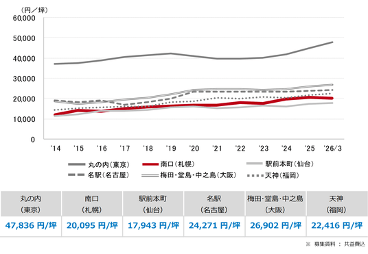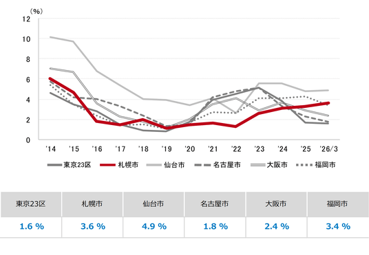 三幸エステート株式会社(本社:東京都中央区、取締役社長:福島正二郎)は、2026年3月度の札幌市オフィス賃貸状況(空室率&現空面積:全規模、募集賃料&募集面積:全規模、規模別空室率、主要エリア※1空室率:全規模)および全国6大都市(東京・札幌・仙台・名古屋・大阪・福岡)の大規模ビルのマーケットデータをまとめた「オフィスマーケット2026年4月号札幌」を公表します。