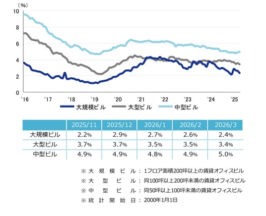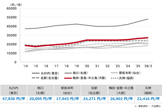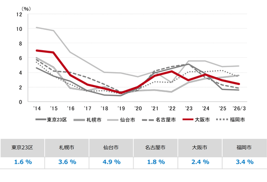 三幸エステート株式会社(本社:東京都中央区、取締役社長:福島正二郎)は、2026年3月度の大阪市オフィス賃貸状況(空室率&現空面積:大規模、募集賃料&募集面積:大規模、規模別空室率、主要3区※1空室率:大規模)および全国6大都市(東京・札幌・仙台・名古屋・大阪・福岡)の大規模ビルのマーケットデータをまとめた「オフィスマーケット2026年4月号大阪」を公表します。
