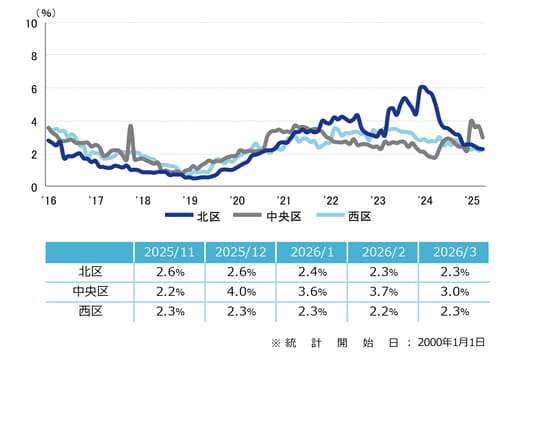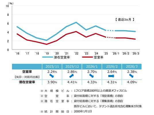空室率は前月比マイナス0.26ポイントの2.38%となり、3ヵ月連続で低下した。新築ビルでまとまった面積の空室が消化され、主な低下要因となっている。エリア別では「中央区」が前月比マイナス0.7ポイントの大幅な低下となった。潜在空室率は前月比マイナス0.22ポイントの4.09%となった。
