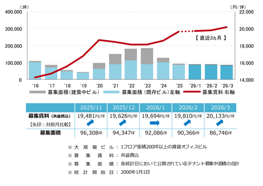 募集賃料は前月比プラス323円/坪の20,133円/坪と、6ヵ月連続で上昇した。緩やかな上昇傾向が継続し、2000年以降で初めて20,000円/坪を上回っている。