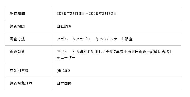 株式会社アガルート(本社:東京都新宿区、代表取締役:岩崎 北斗、以下「アガルート」)が運営する「アガルートアカデミー」は、アガルートの講座を利用して土地家屋調査士試験に合格したユーザーに対し、勉強時間に関するアンケートを実施いたしました。
