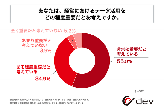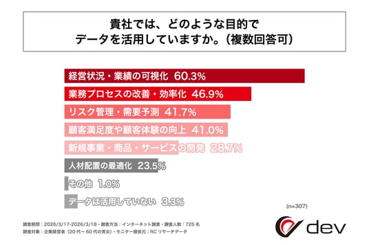 データ分析・活用コンサルティング事業を展開する株式会社dev(本社:長野県松本市、代表取締役:浅田 佑介)は、企業経営者(20代~60代の男女)を対象に「企業の意思決定におけるデータ活用の実態に関する調査」を実施しました。この調査から、企業経営者のデータ活用の取り組み状況やその目的、経営判断におけるデータの活用度合いなどが明らかになりました。