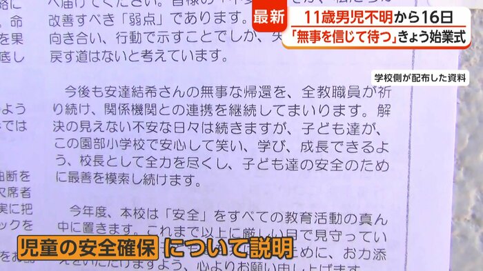 京都・南丹市で3月23日から行方不明となっている11歳の安達結希さんの捜索が続く中、通っていた小学校で始業式が行われた。警察や地域が警戒を強める一方、進展のない状況に保護者や子どもたちの不安が広がっている。