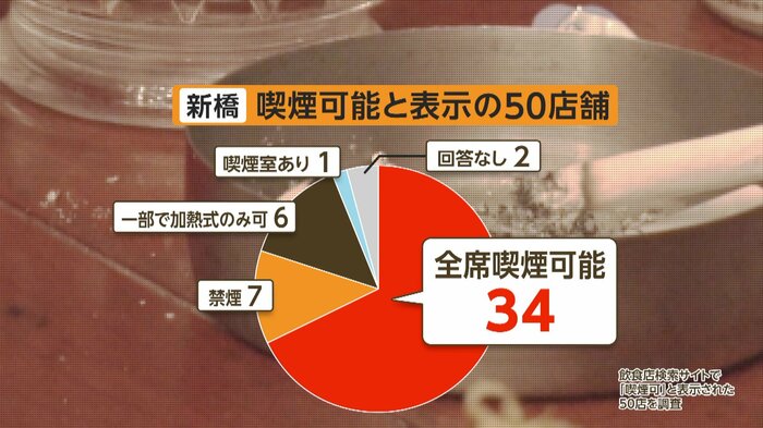 取材した50店舗中、回答があったのは48店舗。全席で喫煙可能と回答したのは34店舗だった。