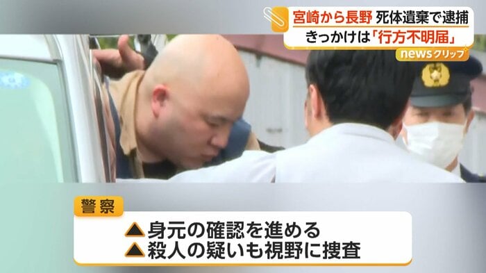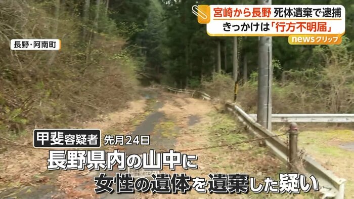 宮崎県警から情報提供を受け長野県警が捜索したところ、供述の通り、長野・阿南町の山の中で高齢女性の遺体が見つかった。