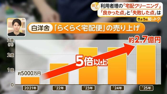 白洋舎の「らくらく宅配便」は年々利用者が増加し、2025年の売り上げは2021年の5倍以上だったという。