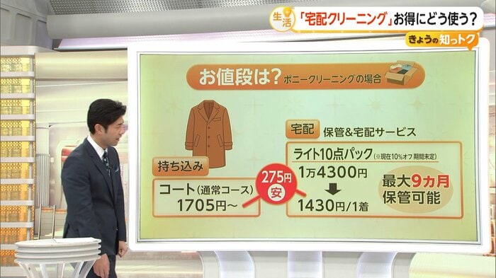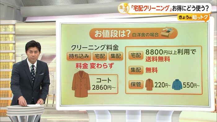 白洋舎では、クリーニング料金は持ち込み、宅配、集配いずれも変わらない。コート1点で2860円~ということです。