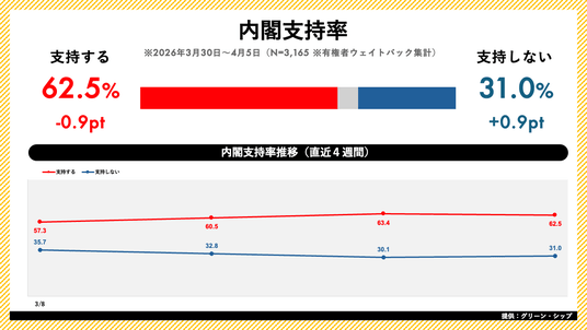 高市内閣の支持率は62.5%(前週比-0.9pt)となりました。