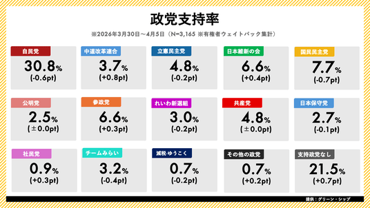ジャッグジャパン株式会社(本社:東京都渋谷区)は、株式会社グリーン・シップ(本社:東京都千代田区)と業務提携し、グリーン・シップが提供する日次世論調査「世論レーダー」のデータを提供しております。本日、2026年4月第1週(3月30日~4月5日分)の内閣支持率・政党支持率調査の結果を発表いたします。