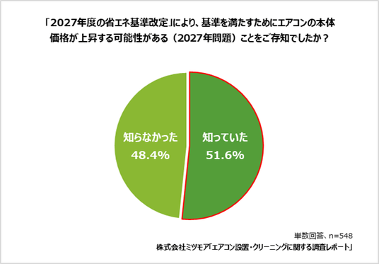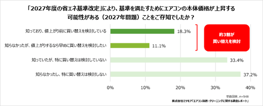 2027年4月から省エネ基準が強化されることに伴い、安価なエアコンが買えなくなる、全体的なエアコンの価格高騰化などが注目されています。調査によると、2027年問題を知っていると回答した人は全体の51.6%。また、アンケート回答者全体の約3割が買い替えを検討しており、一部2027年問題の影響による買い替え需要が見られました。