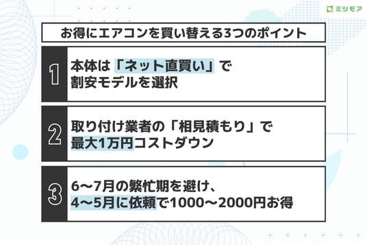 ・買い替えは、エアコン本体の「ネット直買い」+設置業者の「相見積もり」が最安ルート
