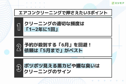 年間を通じて、安くエアコンクリーニングをするには繁忙期である6~8月を過ぎた10~11月ごろに依頼するのがおすすめです。6~8月には、暑くなってきて久しぶりにエアコンを付け、カビ臭さやホコリっぽさなどの異常を感じて依頼するケースが非常に多く見られます。春~夏の依頼の場合は試運転を早めに行い、5月には依頼を済ませておくと安心です。