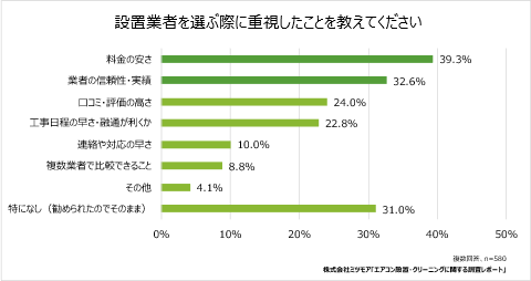 また、業者選びの実態について伺いました。エアコン設置業者を選ぶ際に重視することを尋ねたところ、最も多かった回答は「料金の安さ(39.3%)」、次いで「業者の信頼性・実績(32.6%)」でした。基本的な料金の安さはもちろん、業者選びの際には「コストパフォーマンス」と「信頼できるか」の両立を重視していることが分かります。