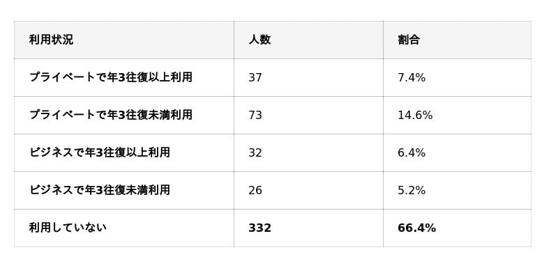 飛行機を「利用していない」が66.4%と大多数。一方、直近1年間で飛行機を利用した人は168名(33.6%)であり、この層に絞ったクロス分析の結果が以下となる。