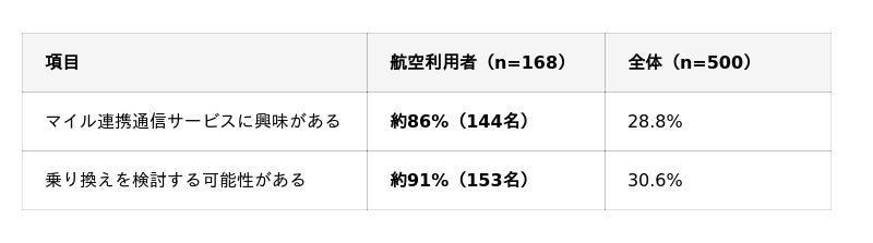 結論:全体では「興味がある」は28.8%にとどまるが、直近1年間で飛行機を利用した168名に限定すると約86%がマイル連携通信サービスに興味を示す。ターゲット層を的確に設定することで、異業種連携型サービスは高い訴求力を発揮できる。